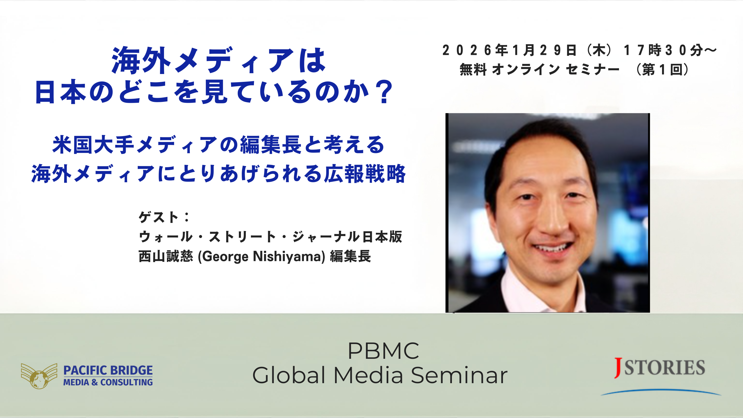 Pacific Bridge Media and Consulting, Inc.(以下、PBMC、本社:東京都)は、毎回世界のメディアやニュース機関の第一線で活躍する専門家をお招きし、海外メディアの特性を理解しながらグローバルメディアと企業PR関係者との接点を探る無料のオンラインメディアセミナー(第一回)を1月29日に開催します。